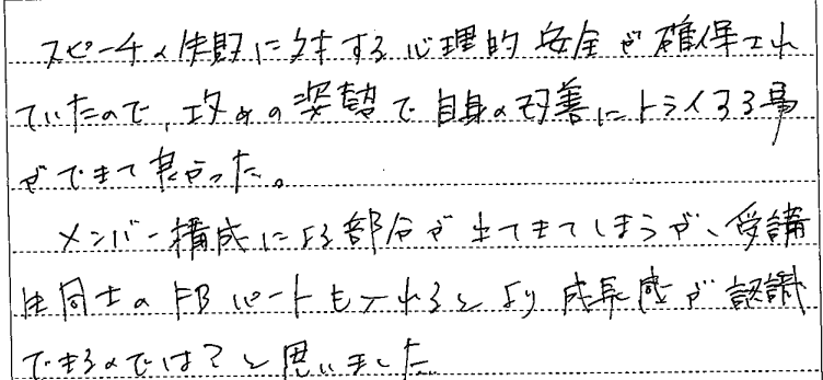 スピーチの失敗に対する心理的安全性が確保されていたので、攻めの姿勢で自身の改善にトライすることができて良かった。