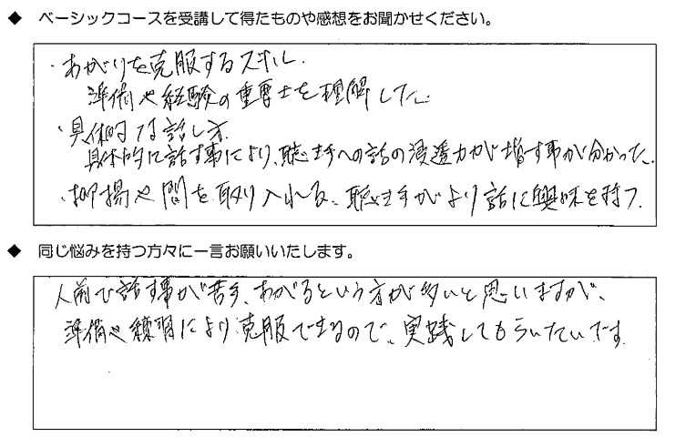 「準備と練習で克服できる」というご自身の経験からのメッセージは、悩んでいる方にとって最高の励みになると思います。今後のご活躍も楽しみにしております。