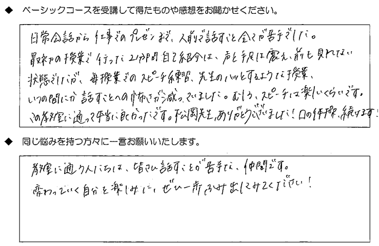最初の授業で行った2分間自己紹介は、声と手足は震え、前も見れない状態でしたが、毎授業でのスピーチ練習、先生のハッとするような授業、 いつの間にか話すことへの怖さが減っていました。むしろ、スピーチは楽しいくらいです。