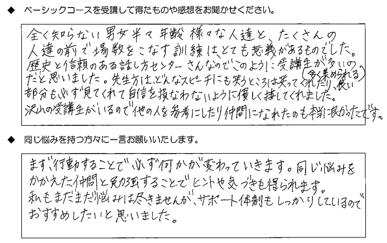 仰る通り、あえて色々な年代や背景の方が集まる場で訓練することに、大きな意味があります。例えば、様々な受講生がいるので他の人のスピーチや改善に向けての姿勢を参考にできたりするのも、弊センターの醍醐味です。その価値に気づいてくださり、また、それが私たちの歴史や信頼に繋がっていると感じていただけたこと、本当に嬉しく思っております。これからも話し方の上達を心から応援しております!