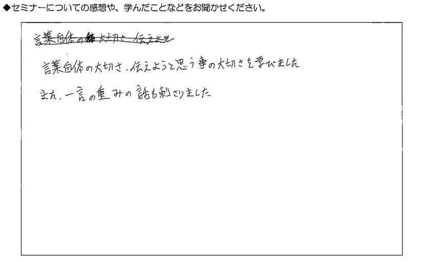 言葉自体の大切さ、伝えようと思う事の大切さを学びました。