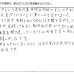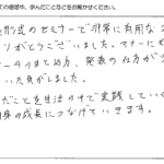 今回のセミナーを受講して、多くの事を学ぶ事が出来ました。今迄は、長く話す事が良い事だと思っていましたが、逆に余分な事を、はぶく事が相手に伝わると学び、勉強になりました。この2日間ありがとうございました。...