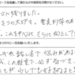 実践中心の内容なのがとても良いと思いました。失敗しても大丈夫!という環境、雰囲気作りをしていただけるので、毎回楽な気持ちでトレーニングできる点も良かったです。