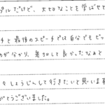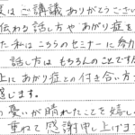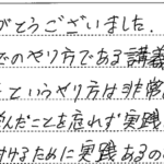 この度はご講義ありがとうございました。相手に伝わる話し方やあがり症を治したいと考えた私は、こちらのセミナーに参加いたしました。話し方はもちろんのことですが、それ以上にあがり症との付き合い方を学んだように感じました。